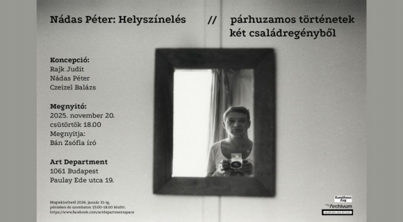 A Nádas Péter: Helyszínelés – párhuzamos történetek két családregényből című kiállítást, ami Rajk Judit, Nádas Péter és Czeizel Balázs koncepciója alapján valósul meg, 2025. november 20-án, csütörtökön 18 órakor Bán Zsófia író nyitja meg a Paulay Ede utcai Art Departmentben. A tárlat a szerző válogatott dokumentarista fotóit is bemutatja, mégis leginkább olvasásra hívja a látogatót, mert tárgya a szöveg: sok-sok érdekes párhuzam, véletlennek tűnő egybeesések dokumentumai.